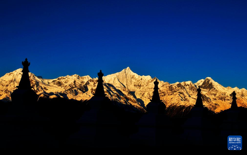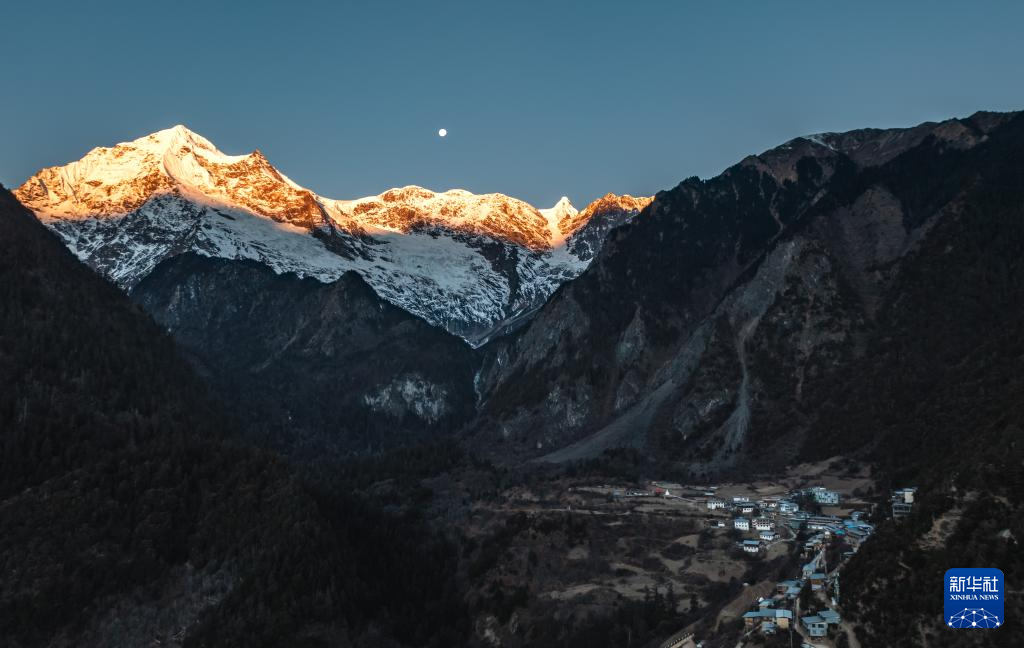 2023年1月9日在雨崩村拍攝的梅里雪山“日照金山”景象(無人機照片)。新華社記者 王冠森 攝