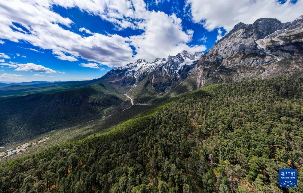 這是2024年3月28日拍攝的云南麗江森林生物多樣性國家野外科學觀測研究站云杉坪大樣地,遠處是玉龍雪山(無人機照片)。新華社記者 陳欣波 攝