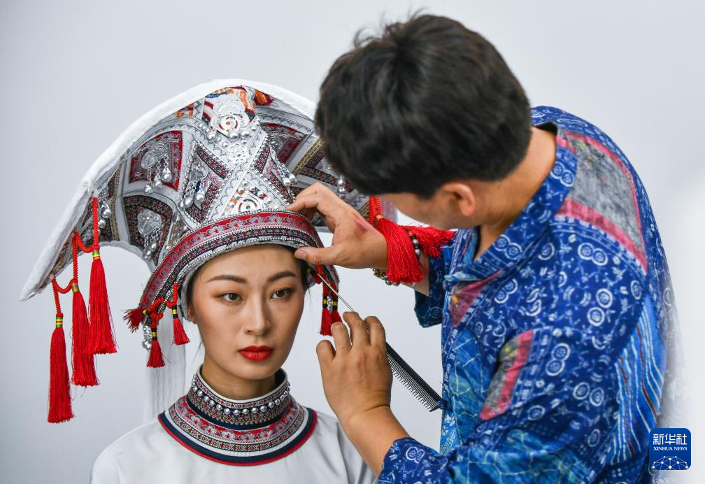8月27日,在昆明一處攝影棚內,一名穿著參展服飾的模特(左)拍攝定妝照前整理頭飾。新華社記者 王靜頤 攝