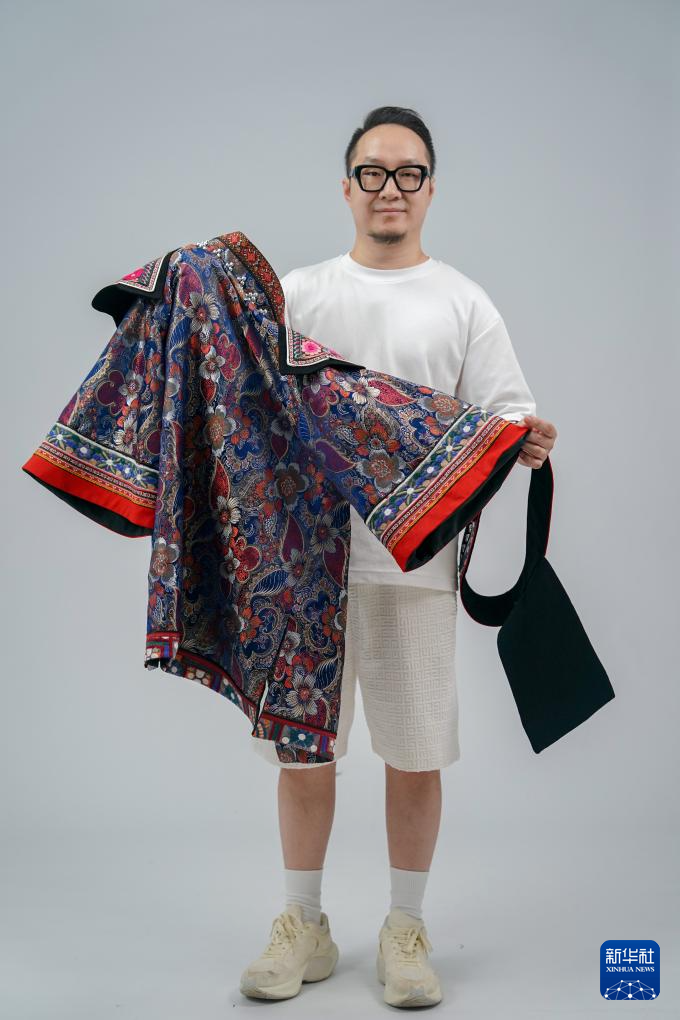 8月27日,在昆明一處攝影棚內,云南藝術學院設計學院服裝與服飾設計系教師范佳展示一件將赴巴黎參展的彝繡服裝。范佳是參展彝族服飾作品的設計師之一。新華社記者 陳欣波 攝