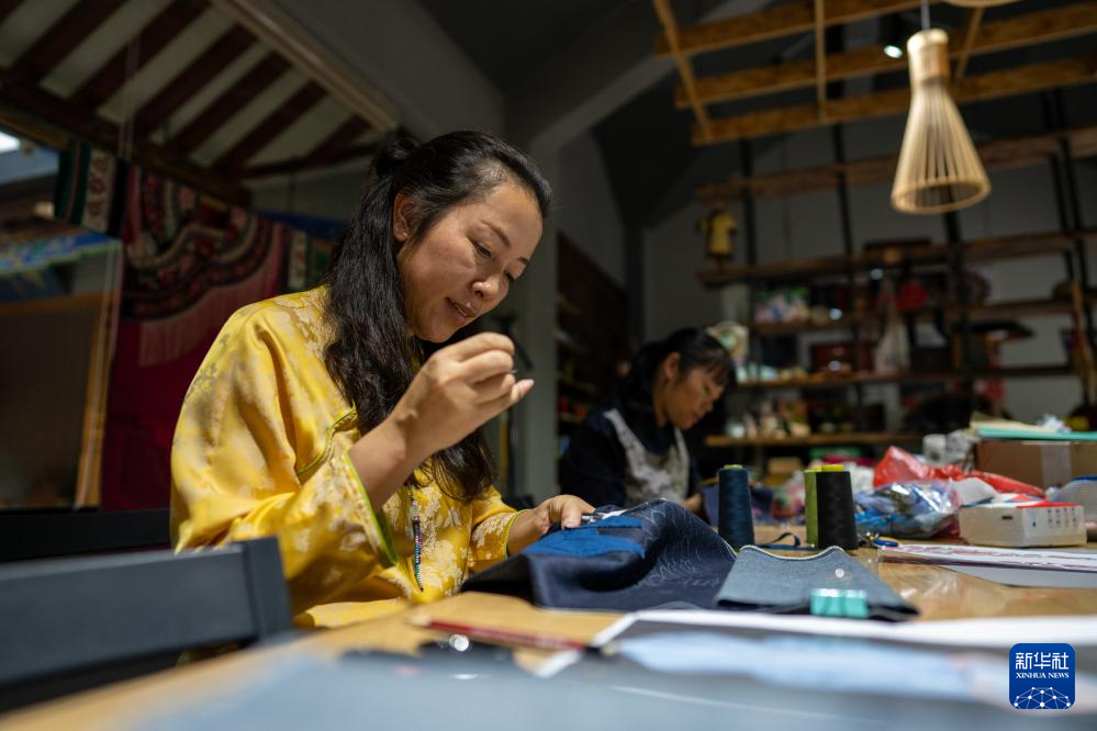 9月7日,國家級非物質文化遺產代表性項目彝族服飾州級代表性傳承人盧潔瑩在自己云南楚雄的工作室內制作繡品。盧潔瑩是赴巴黎參展彝族服飾作品的設計師之一。新華社記者 江文耀 攝
