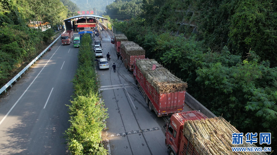 勐滿口岸入境甘蔗車輛航拍 (10月29日攝)。新華網發(李揚攝)