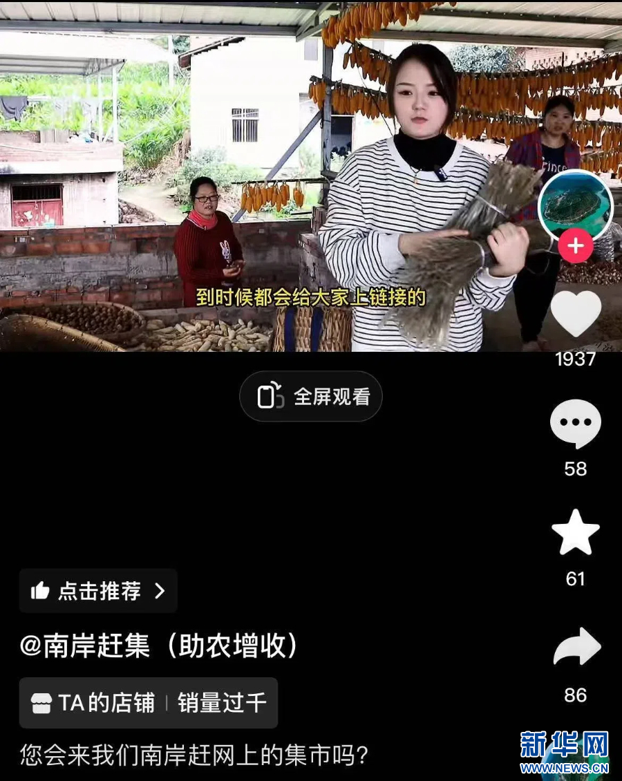 “人氣最高的時候直播間有上千人,全國各地的客戶都有?!蹦习舵傸h委書記趙晏說,“南岸趕集”是南岸鎮在抖音平臺上開通的助農賬號,旨在幫助村中老人打開土特產銷售渠道,產品不固定,“主要取決于村民家里有啥?!蹦壳?,“南岸趕集”賬號的店鋪主頁顯示,售價60元的“農家土副產品”已售103件,好評率100%。