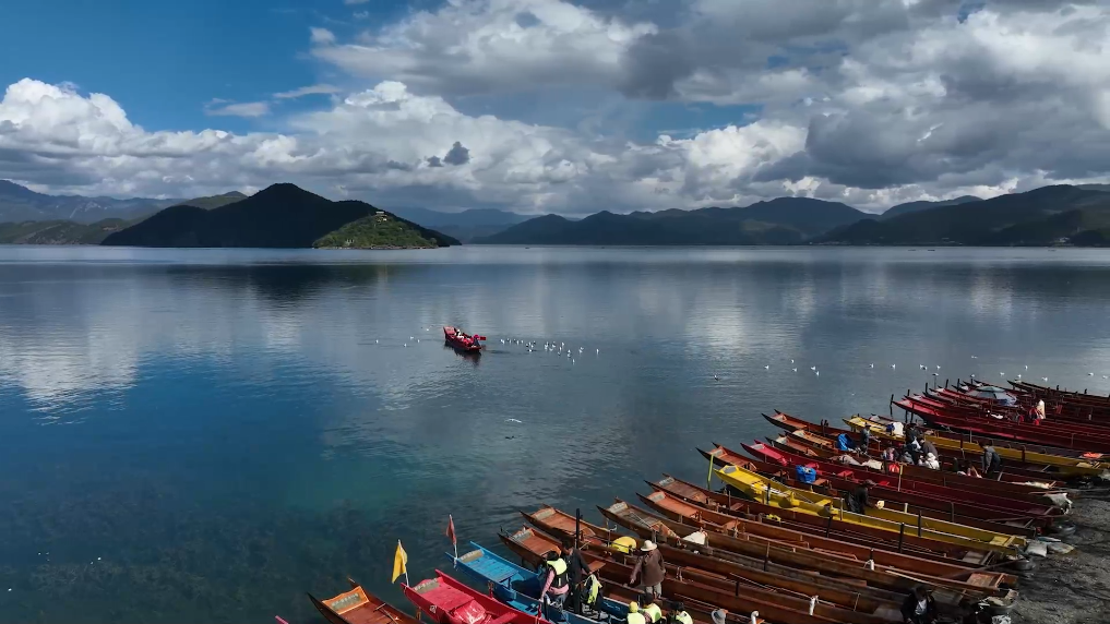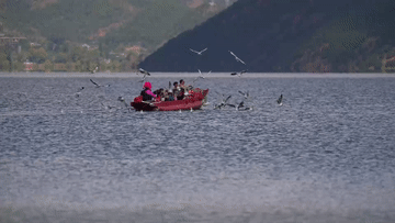 11月的云南瀘沽湖,紅嘴鷗、骨頂雞等候鳥已經抵達。瀘沽湖地處云南省麗江市寧蒗彝族自治縣與四川省涼山彝族自治州鹽源縣交界處,水質長期穩定保持地表水I類標準,是候鳥的“詩意棲居地”。