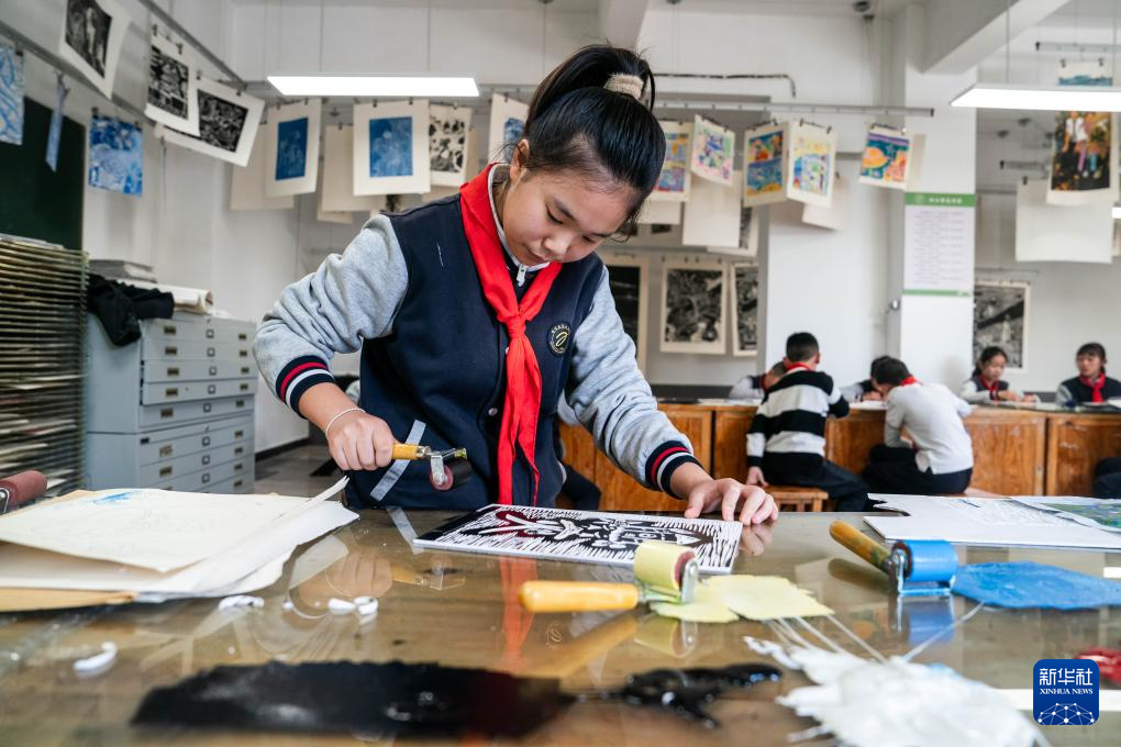 11月12日,曲靖市第二小學的學生在創作當地特色的爨文化版畫作品。新華社記者 胡超 攝