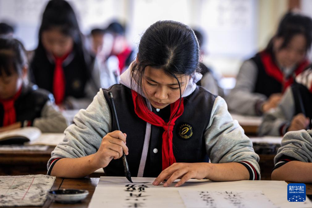 11月12日,曲靖市第二小學的學生在上書法課。新華社記者 胡超 攝