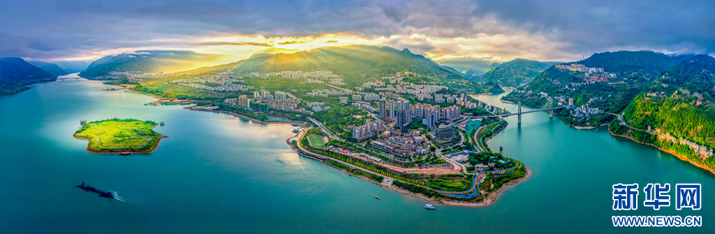 朝陽映襯下的江畔小城綏江,水清岸綠景美(10月23日攝)。新華網發(曾三東 攝)