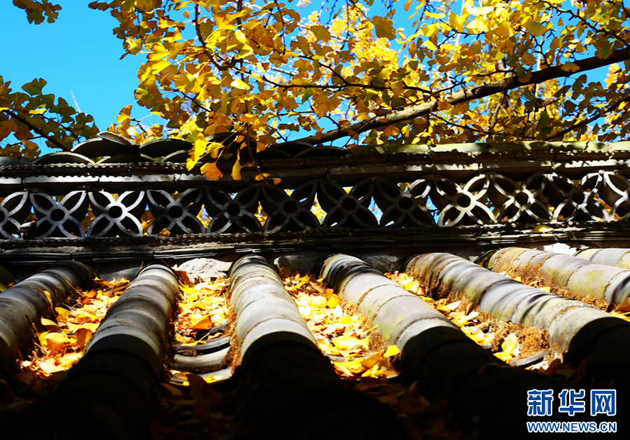 銀杏葉堆落于瓦片上(12月1日攝)。新華網發(趙輝 攝)