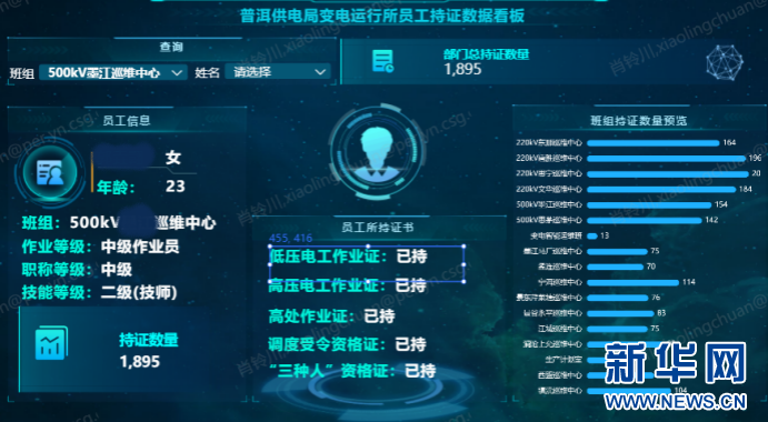 二是“變電—持證臺賬看板”場景通過接入公司員工信息管理系統,實現了員工持證情況的快速查詢和動態更新。業務人員登錄場景后,只需短短幾分鐘,就能獲取到員工的證件類型、有效期、復審日期等關鍵信息。這不僅大大縮短了開工準備時間,提高了工作任務執行效率,更在源頭上保障了業務人員的資質安全?!霸趹昧顺肿C臺賬看板后,我們變電站的業務人員資質核查工作變得更加便捷高效,工作監督人員的壓力也大大減輕了?!弊冸娬緲I務人員李心凌感慨道。