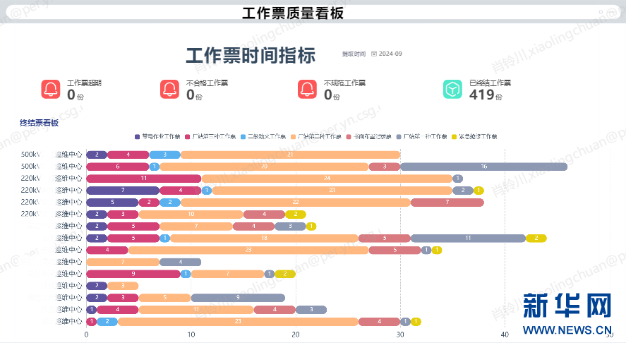 三是“變電—工作票質量看板”場景優化工作票管理流程。李心凌介紹,工作票是業務人員執行工作的指導書,不合格的工作票極易造成惡劣影響,超期、辦結工作票也需要及時統計,否則會影響居民用電。對此,普洱供電局通過運用“變電—工作票質量看板”場景打通了數據中心鏈路,提取工作票數據,并完成數據計算,實時展現不合格、辦結、超時狀態工作票統計數據,及時提醒負責人員整改。據李心凌介紹,在應用了該場景后,變電站工作票的超期提醒延時控制在1小時以內,不合格工作票整改提醒延時更是縮短到了5分鐘以內。這不僅優化了工作票管理流程,更有力提升了工作票管理質量。(完)