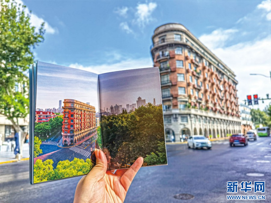 在武康大樓“源點廣場”,游客手持“口袋書”與大樓合影(資料圖)。新華社記者 陳愛平 攝