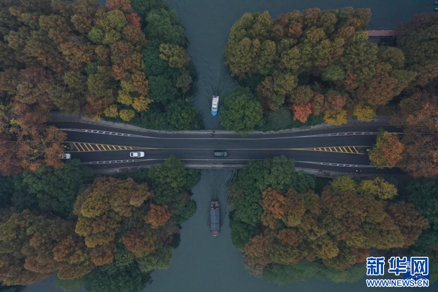 12月3日,汽車行駛在杭州西湖景區的楊公堤,游船從橋下穿過(無人機照片)。新華社記者 黃宗治 攝