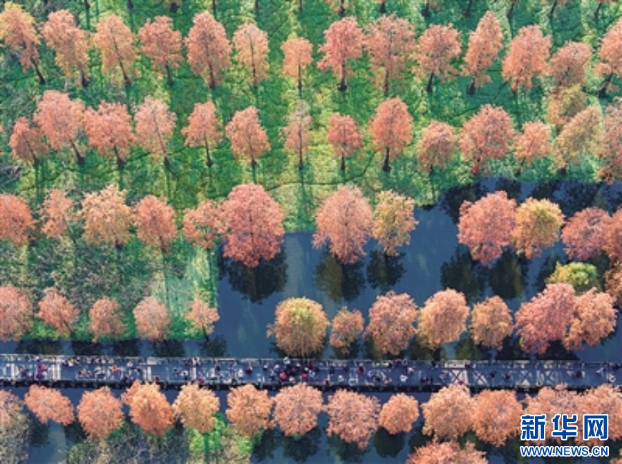 游客在上海青西郊野公園的水上森林欣賞美景(資料圖)。新華網發(王須中 攝)