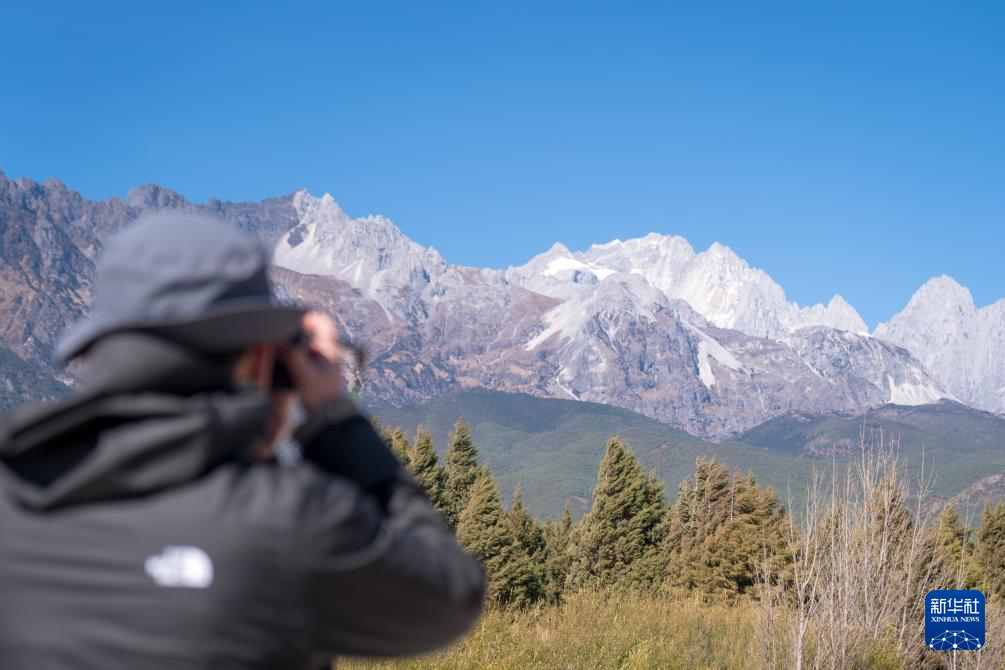 12月13日,游客在麗江市一處星空營地拍攝雪山。