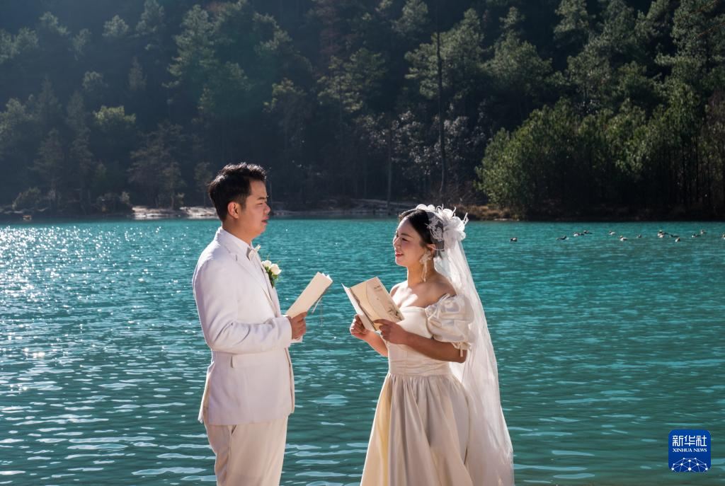 12月13日,游客在麗江市玉龍雪山景區藍月谷拍婚紗照。