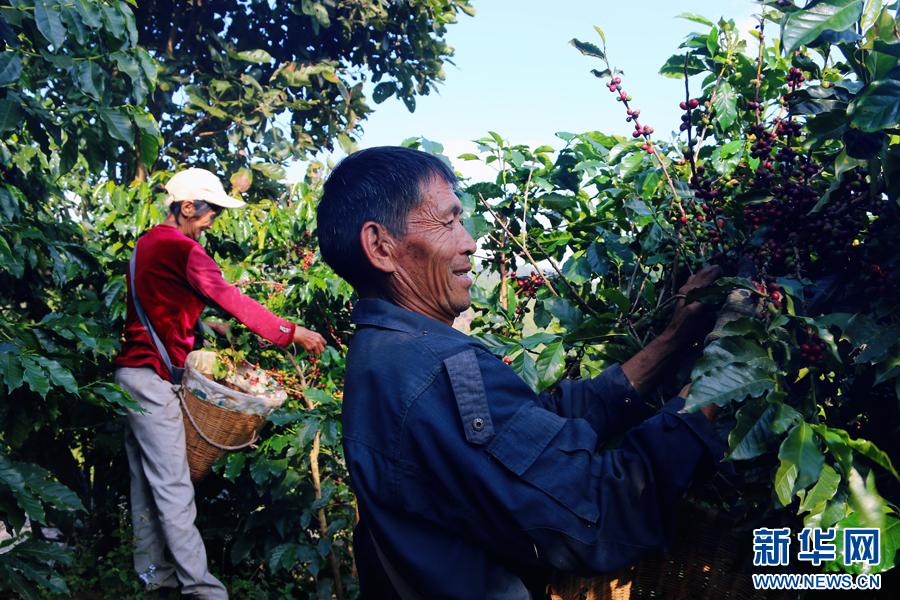 走進云南省普洱市景谷傣族彝族自治縣威遠鎮暖里村,1.4萬畝咖啡種植基地里紅綠相間,咖啡鮮果長勢喜人。暖里村丫口小組的咖農李應榮背著背簍,精心挑選著枝上紅艷的咖啡鮮果,采摘入簍。