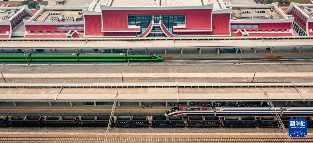 “復興號”(上)、“瀾滄號”動車組列車??吭谥欣翔F路磨憨站(2023年4月13日攝,無人機照片)。新華社記者 胡超 攝