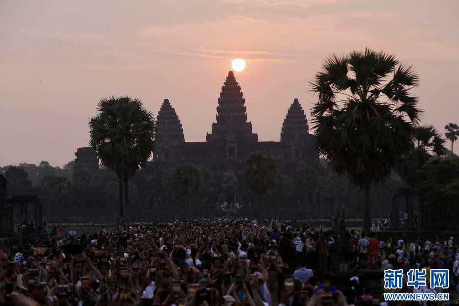 在柬埔寨暹粒,游客在吳哥窟觀看日出(2024年3月22日攝)。新華社發(批隆 攝)