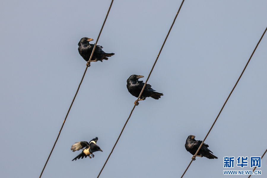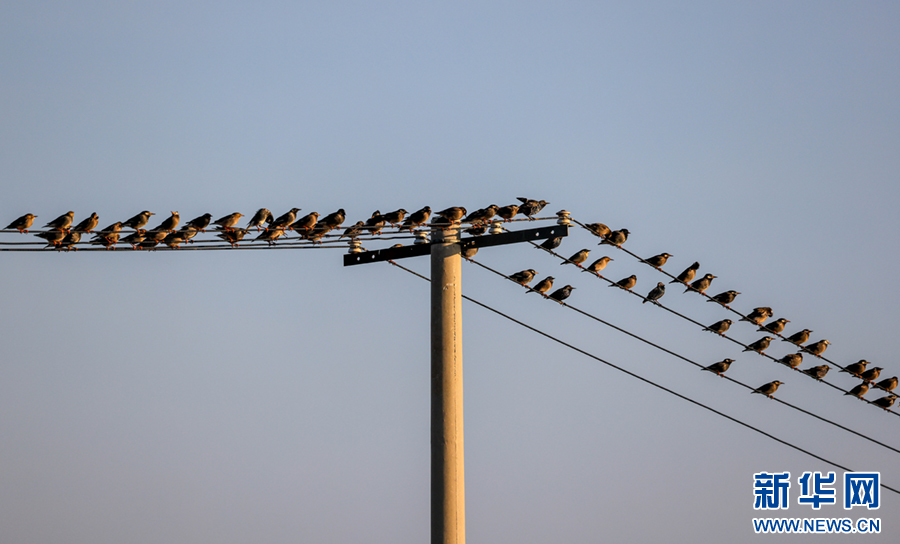 灰椋鳥成群立于電線上(12月14日攝)。新華網發(孫文來 攝)