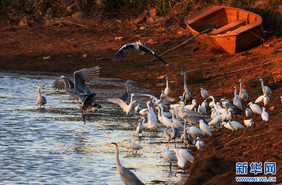 夕陽下,鷺鳥岸邊嬉戲(12月14日攝)。新華網發(孫文來 攝)