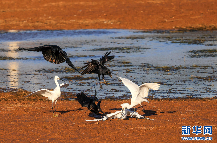 白鷺與烏鴉爭搶食物(12月14日攝)。新華網發(孫文來 攝)