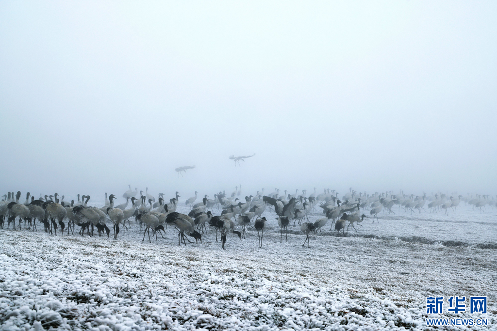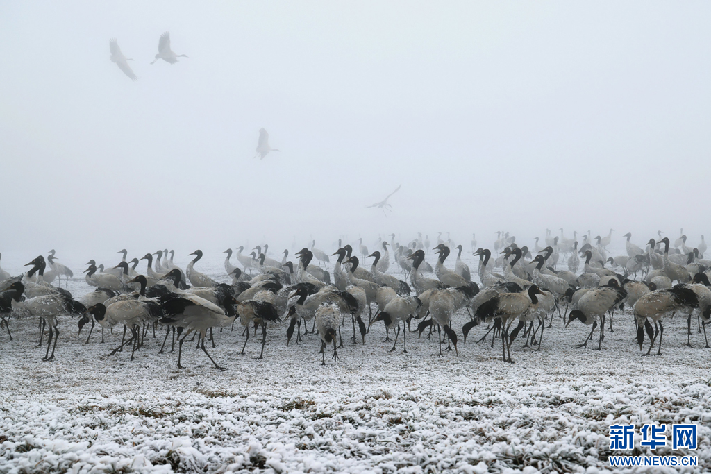 冰霧中的黑頸鶴(12月15日攝)。新華網發(鄭遠見 攝)