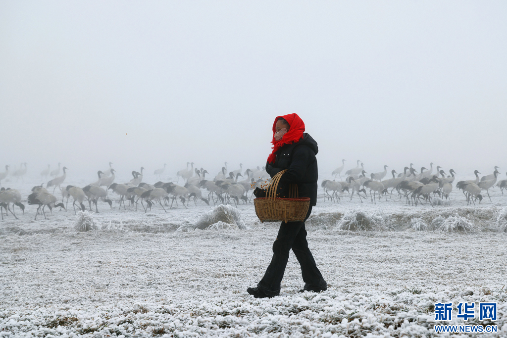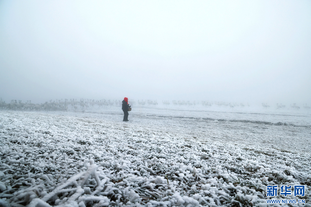 護鶴員與冰霧中的黑頸鶴(12月15日攝)。新華網發(鄭遠見 攝)