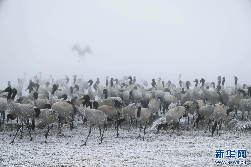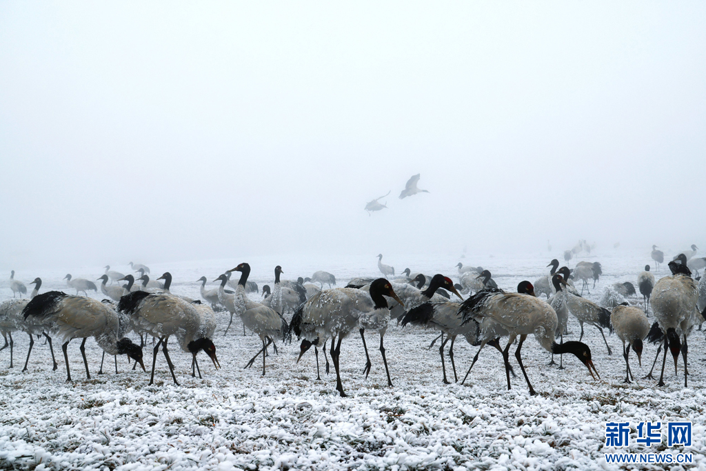黑頸鶴在大山包冰雪中繪就生態美景_新華網