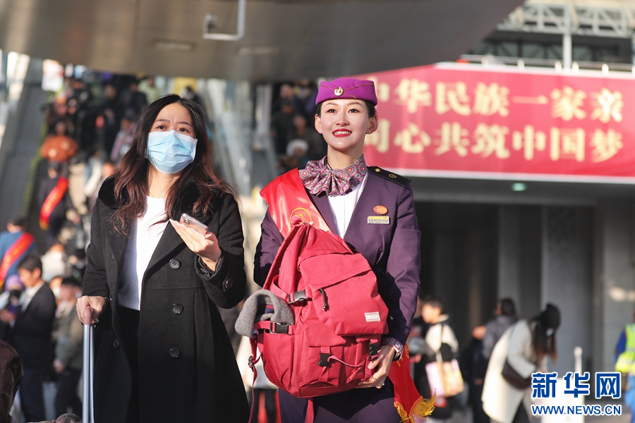 1月14日,國鐵昆明局工作人員引導旅客進站上車。新華網發(楊紫軒 攝)