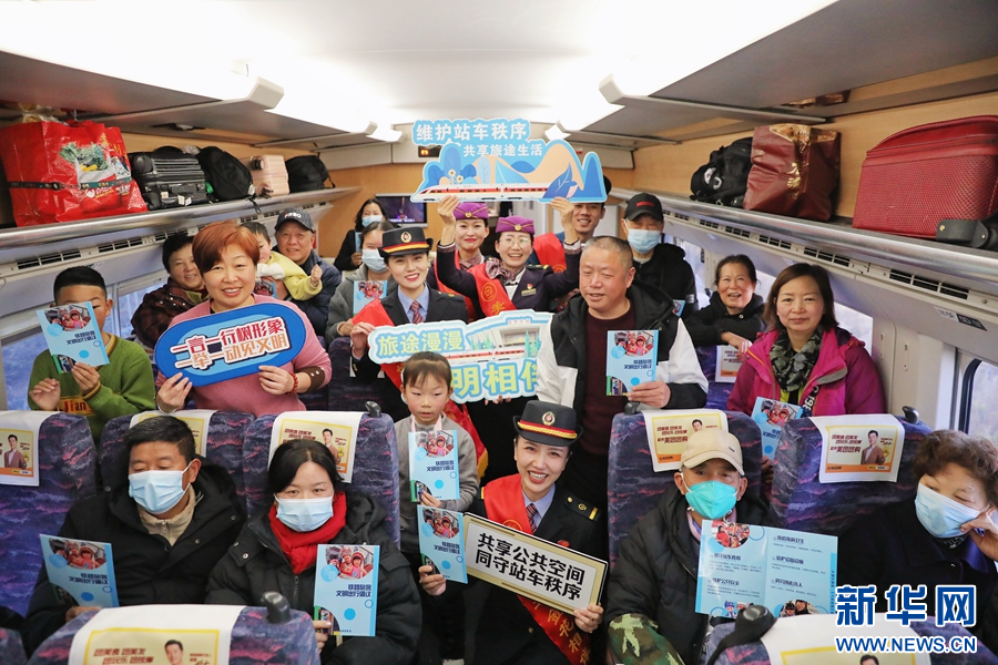 1月14日,國鐵昆明局乘務員在列車上開展文明出行宣傳活動。新華網發(楊紫軒 攝)
