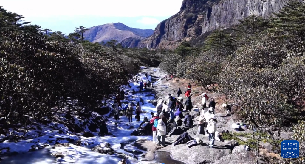 位于春城昆明北部的轎子雪山,是中國緯度最低的冬季積雪山峰之一。隆冬時節,這座雪山再度披上銀裝。鮮見雪景的東南亞游客興奮地到此體驗高山冰雪游,藍天、冰湖、冰瀑、霧凇成為他們鏡頭下的“寵兒”。
