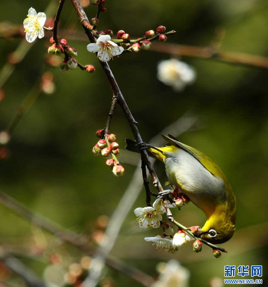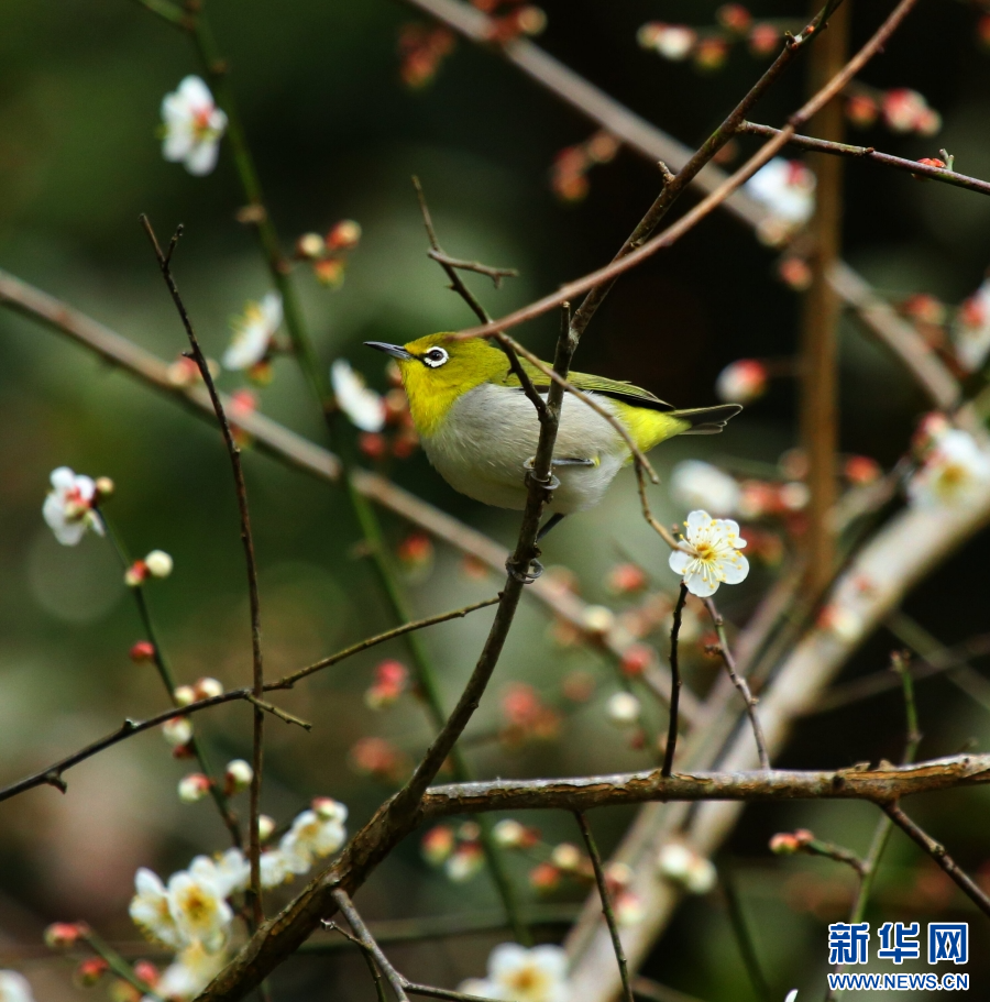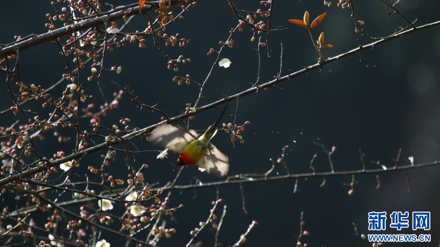 云南騰沖,梅花初綻,鳥兒嬉戲(1月13日攝)。新華網發(趙輝 攝)