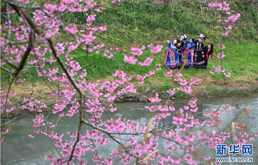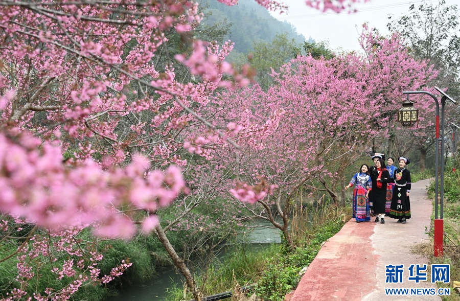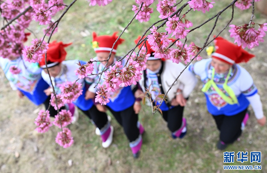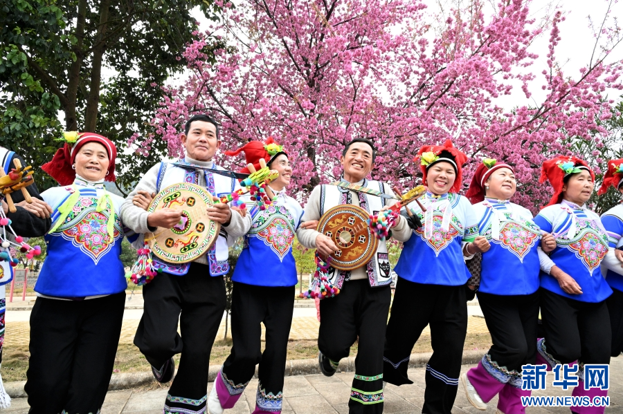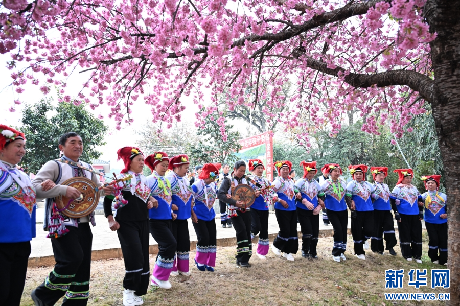 1月11日,在云南省文山壯族苗族自治州硯山縣維摩彝族鄉黑魚洞村,當地群眾在盛開的櫻花樹下跳弦子舞(1月11日攝)。新華網發(熊平祥 攝)