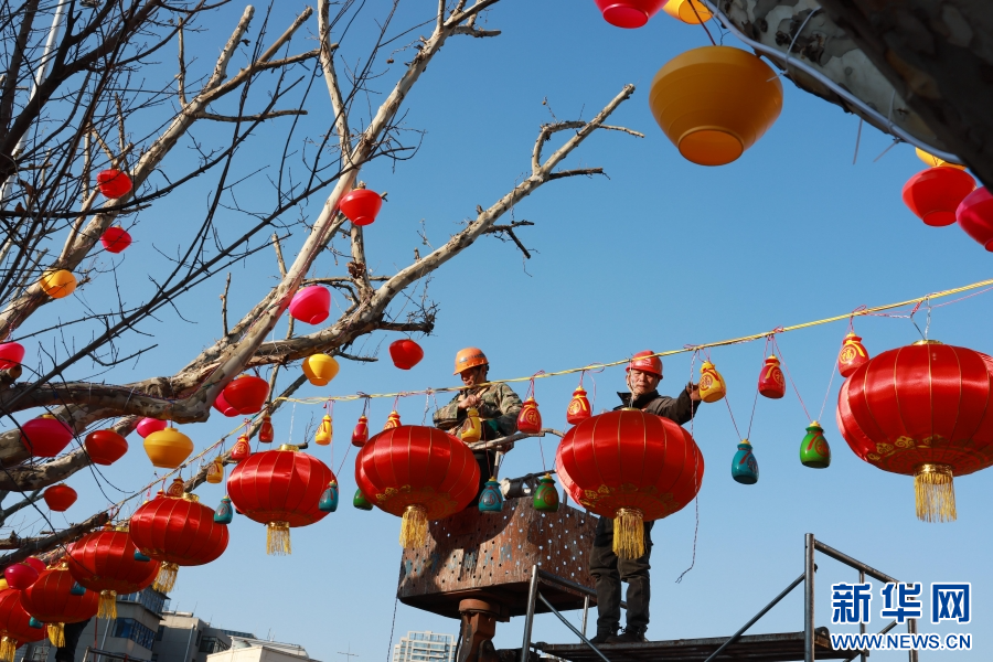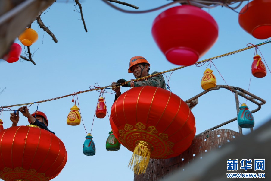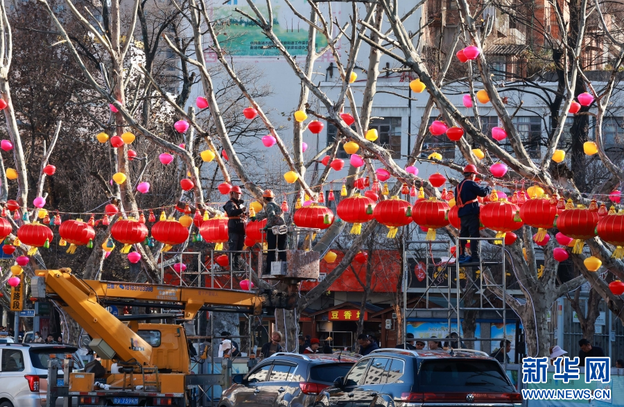 云南曲靖,工作人員在街道上安裝燈飾,喜迎新春(1月13日攝)。新華網發(孫文來 攝)
