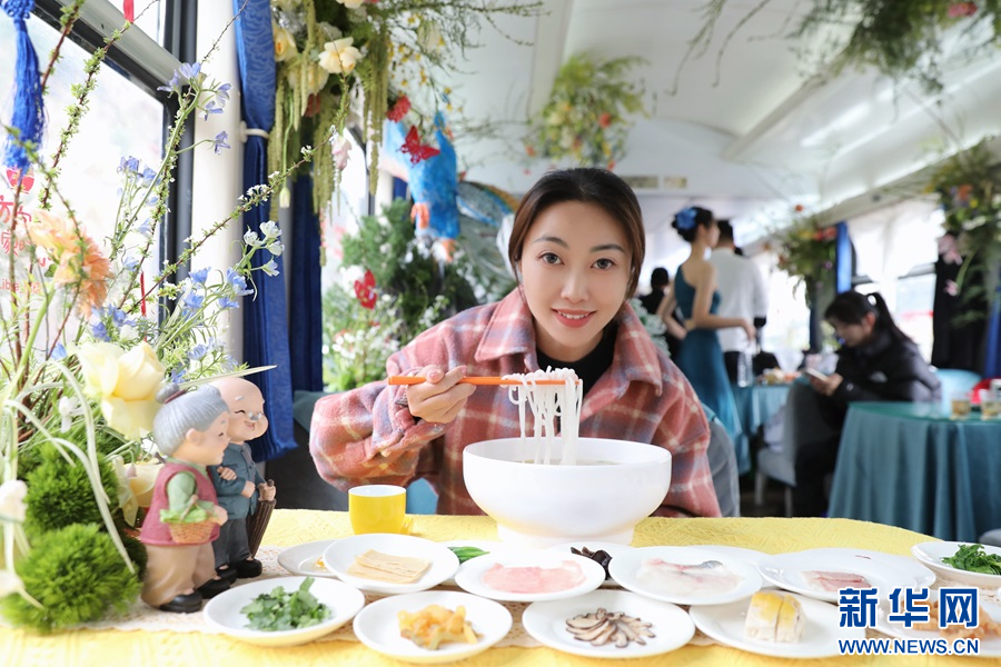 車廂內,云南青年表演民族山歌打跳,動聽的山歌此起彼伏,讓旅客零距離感受云南山歌文化的獨特魅力;廚藝師傅邀請旅客共同制作鮮花過橋米線,品嘗鮮花餅和玫瑰花飲等美食,感知云南與花共生、以花為食的浪漫。