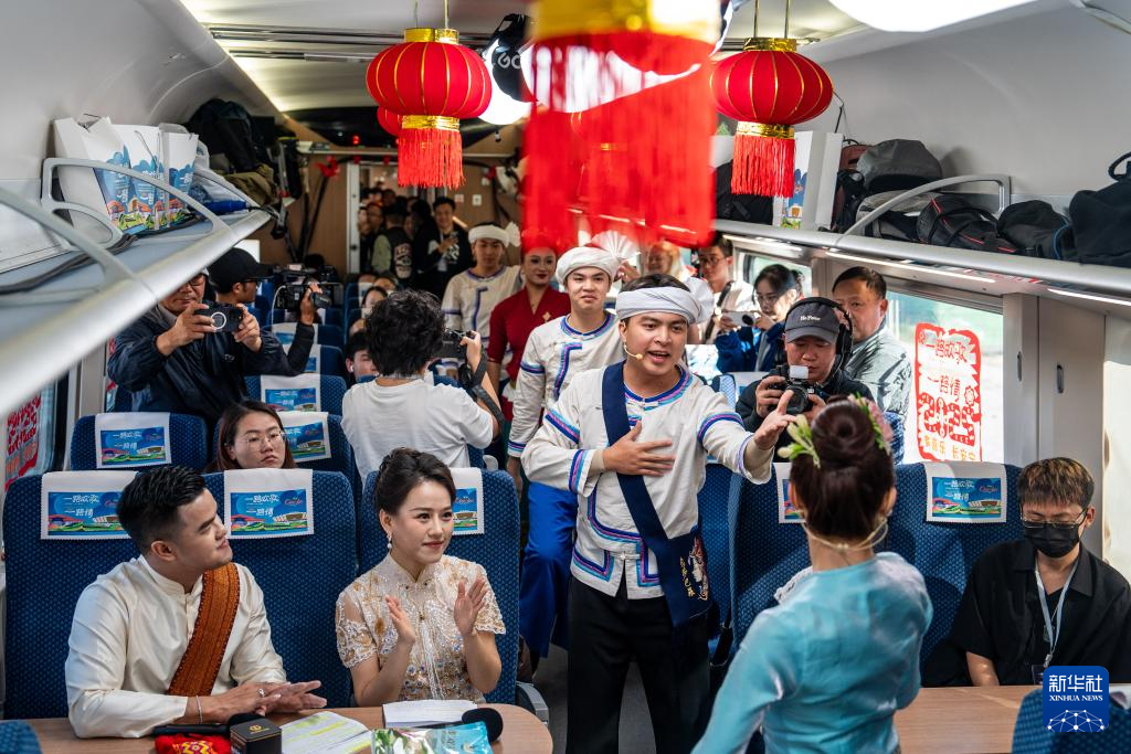 1月14日,西雙版納州民族文化工作團的演員在D87次中老鐵路國際旅客列車上表演歌舞。新華社記者 胡超 攝