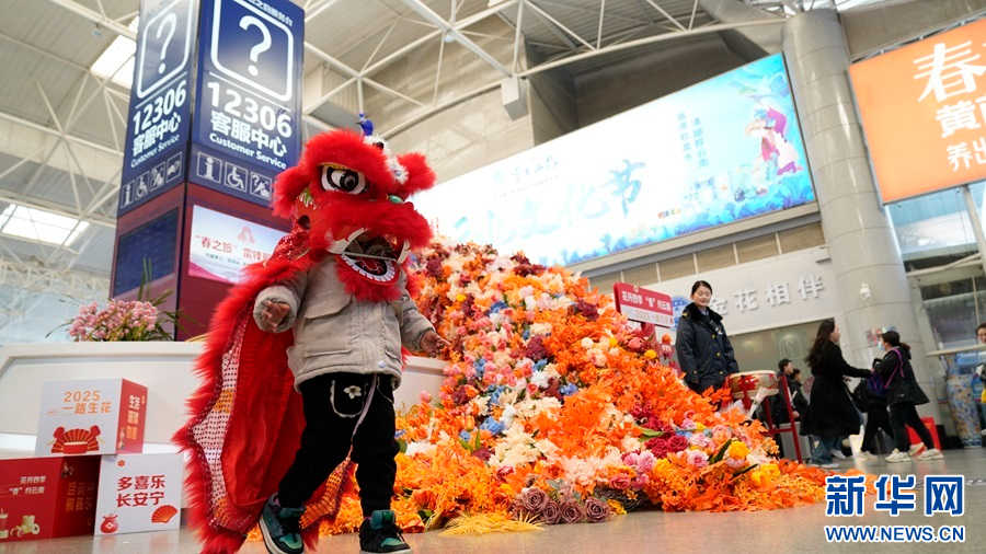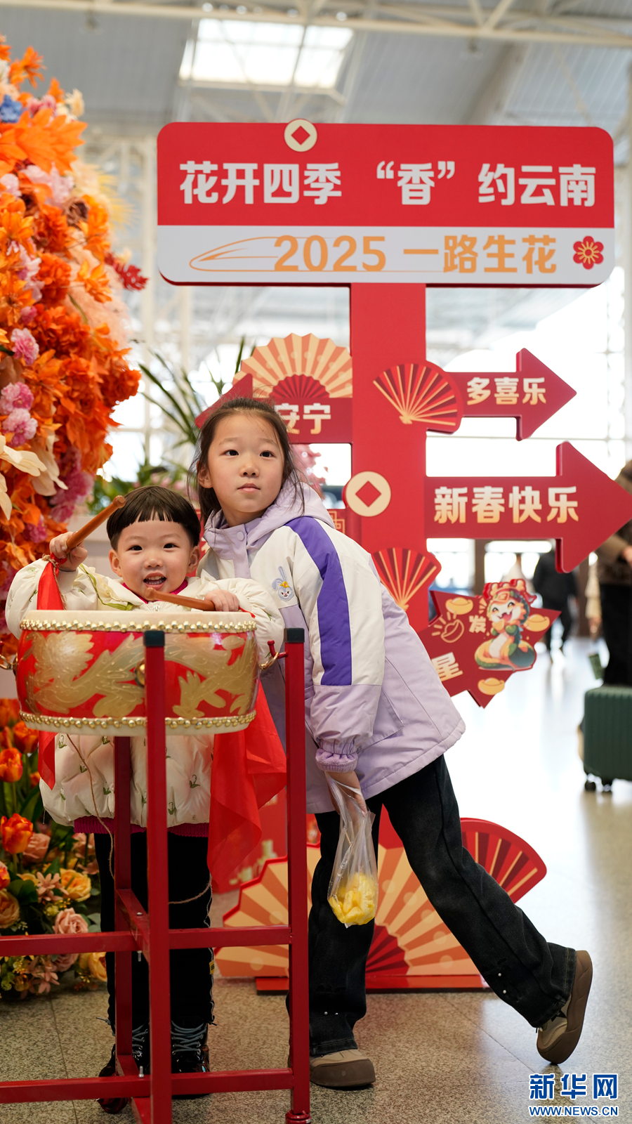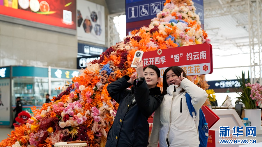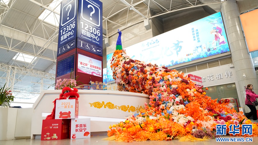 春運期間,在昆明火車站“金花·彩云之窗”客服中心旁,一只由繡球、百合、郁金香等數千枝鮮花編織而成的孔雀栩栩如生,為春運旅客的返鄉旅途增添了一道亮麗的風景線。圍繞“回家的路,就是最美的風景”“花開四季 ‘香’約云南”宣傳主題,中國鐵路昆明局集團有限公司融合云南鮮花和春節文化元素,在昆明火車站候車廳打造了多個“打卡”點,并開展了形式多樣的迎新春活動,營造出濃厚的節日氛圍。(完)(樊亞 趙?。?/p>