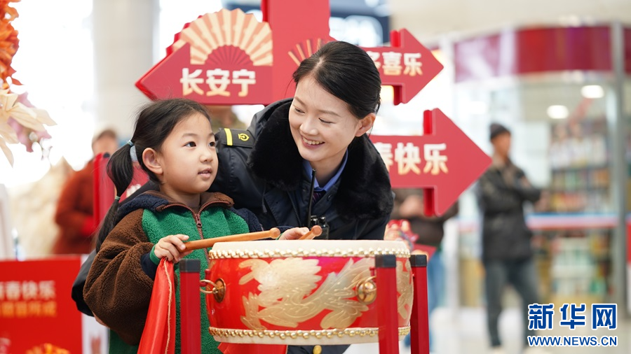 工作人員與旅客敲鼓迎新春(1月15日攝)。新華網發(趙健 攝)