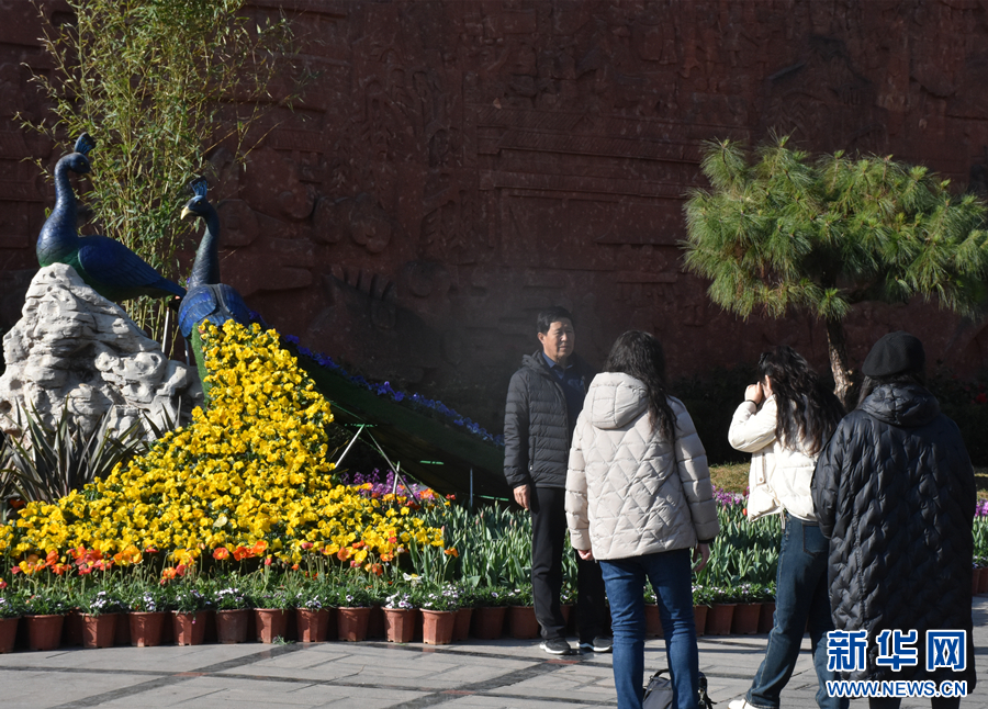 游客觀賞麗江古城春花展并拍照留念(1月21日攝)。新華網發(和潤仙 攝)