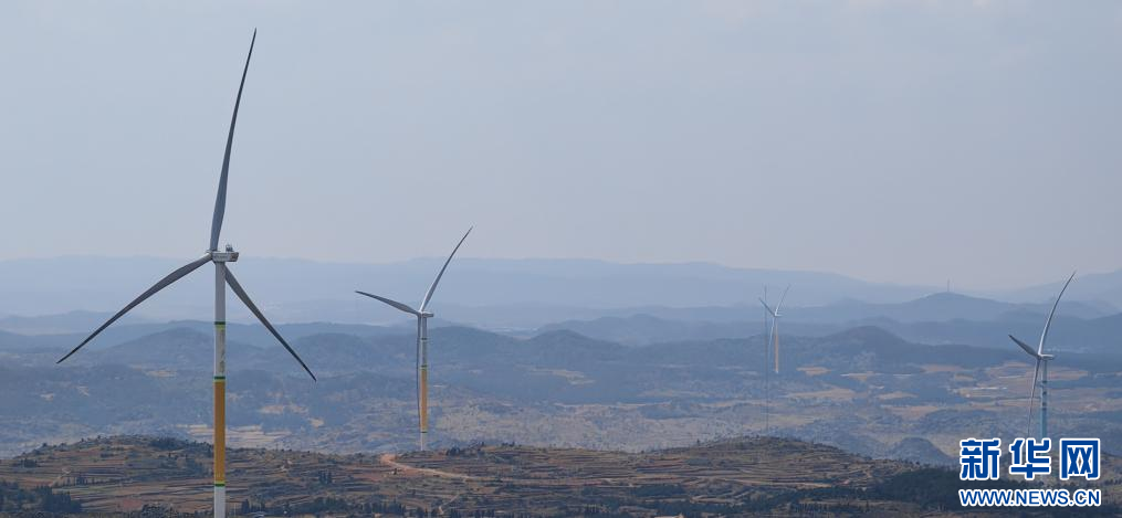 位于云南省富源縣的國電投富源西風電場,幾臺風機正在運轉。(2024年3月26日攝)。新華社記者 浦超 攝