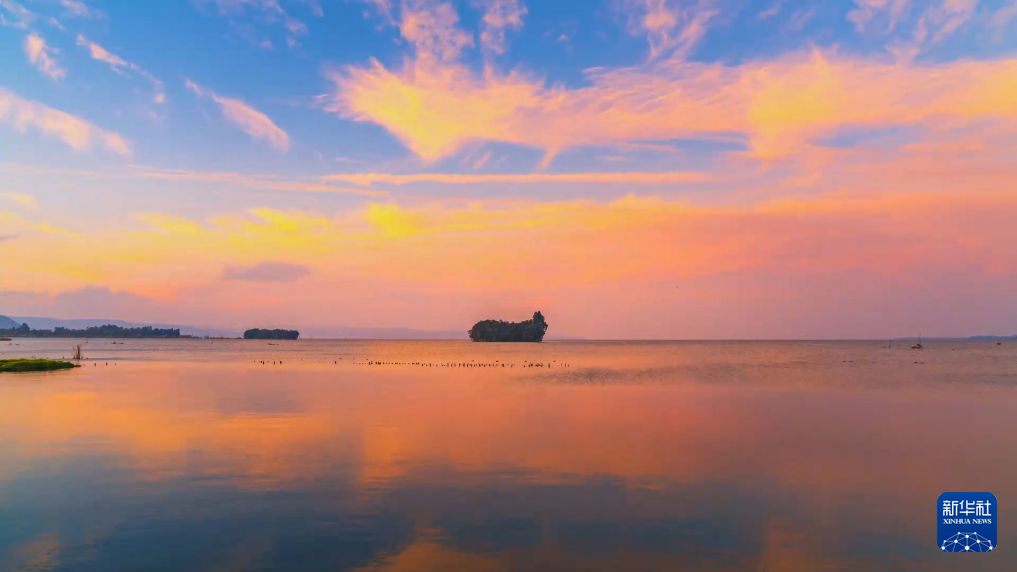 夕陽西下,晚霞染紅天際,湖面披上金色的紗幔。