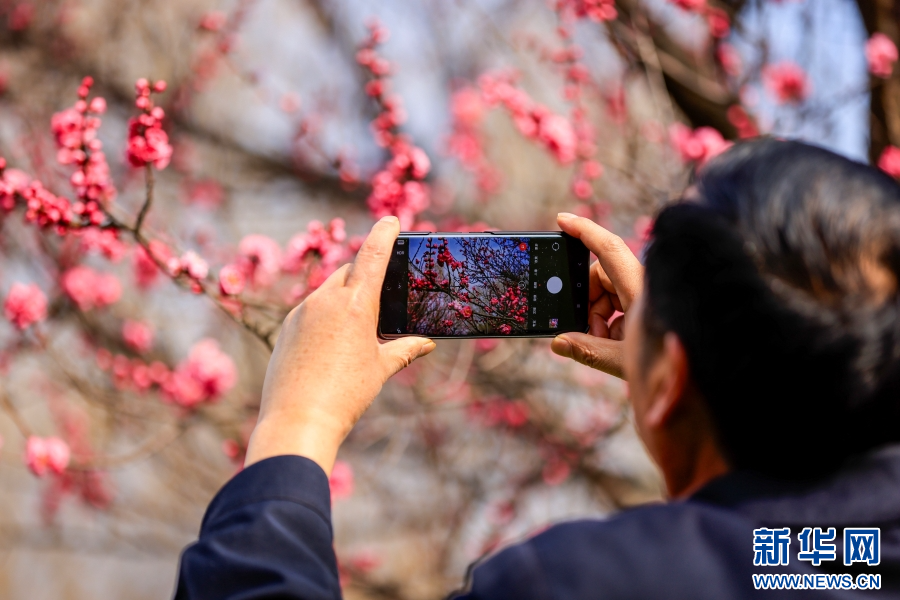 云南省曲靖市沾益區玉林廣場梅花競相綻放,游人拍照賞花(2月3日攝)。新華網發(孫文來 攝)