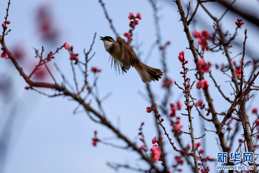 云南省曲靖市沾益區玉林廣場,鳥兒在梅花間嬉戲(2月3日攝)。新華網發(孫文來 攝)