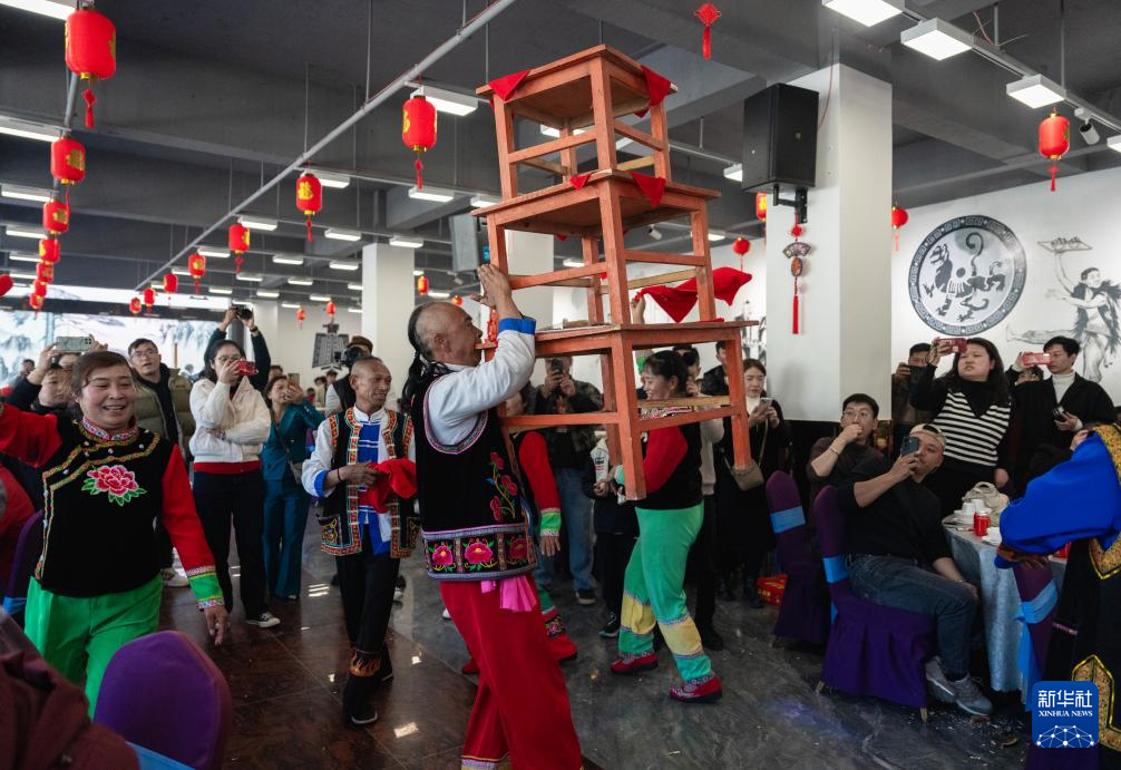 2月7日,在南澗縣寶華鎮擁政村,跳菜表演者在進行口功上菜表演。新華社發(適志宏攝)