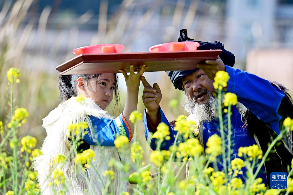 2月5日,南澗彝族跳菜省級非物質文化遺產代表性傳承人阿本枝(中)在給孫輩傳授跳菜技藝。新華社記者 陳欣波 攝