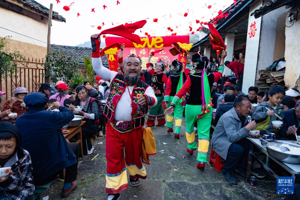 2月5日,跳菜表演者在南澗縣無量山鎮一家酒店舉辦的婚禮上表演。新華社記者 陳欣波 攝