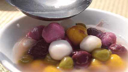 為天然染料制作的粉、綠、黃、紫四色湯圓