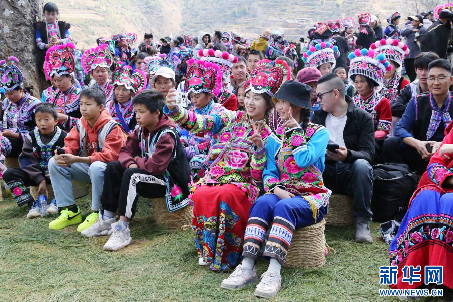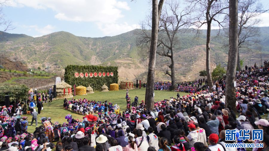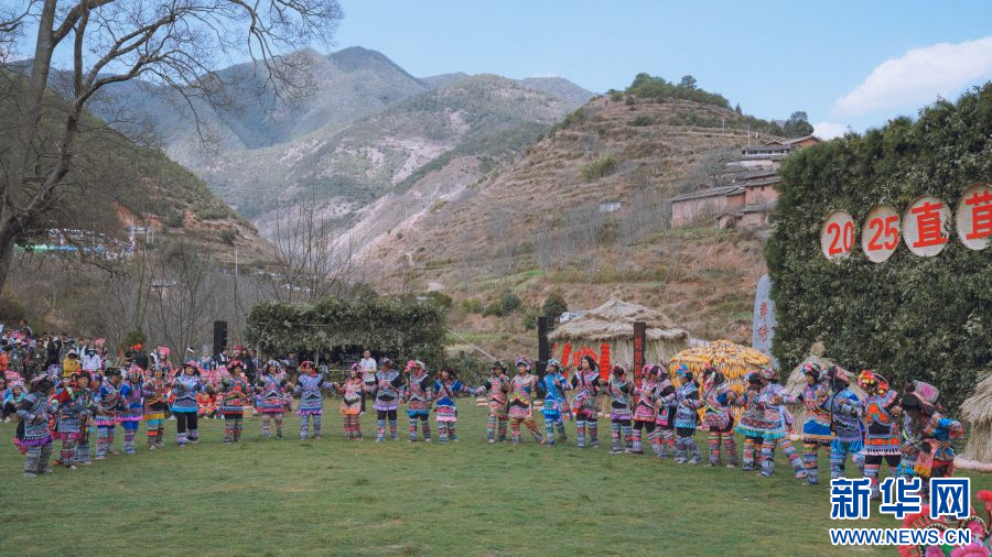 2月12日,在云南省楚雄彝族自治州永仁縣直苴村,來自各村寨的群眾身著傳統節日盛裝匯聚于此,載歌載舞,開啟一年一度的賽裝節。