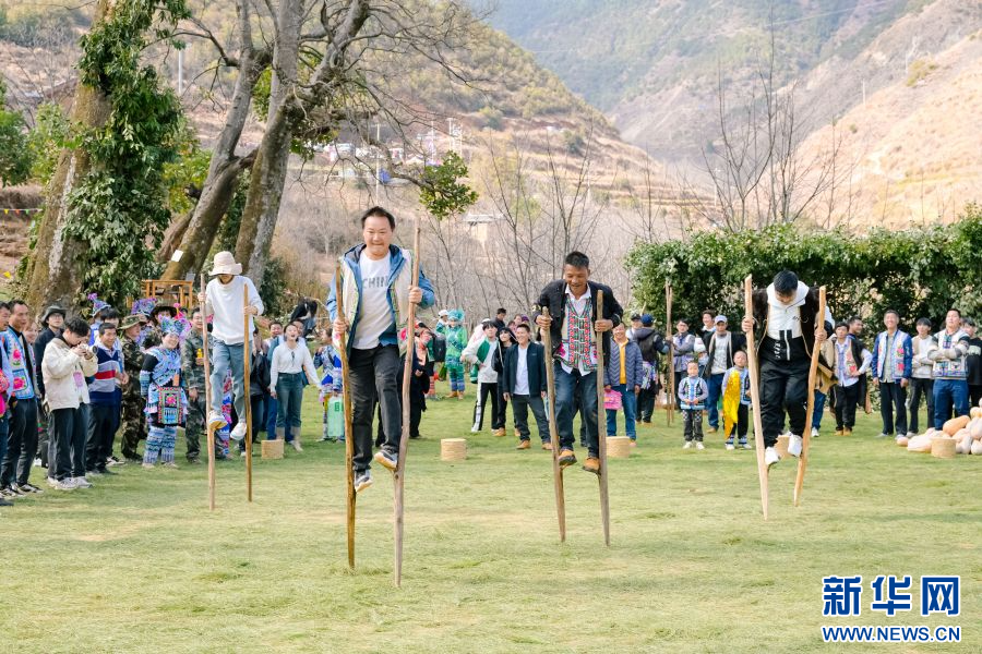 踩高蹺(2月12日攝)。新華網發(永仁縣融媒體中心供圖)