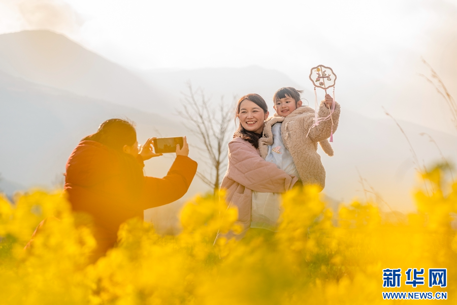游客在洱源縣鳳羽古鎮的油菜花田里拍照(攝于2月16日)。新華網發(羅新才 攝)